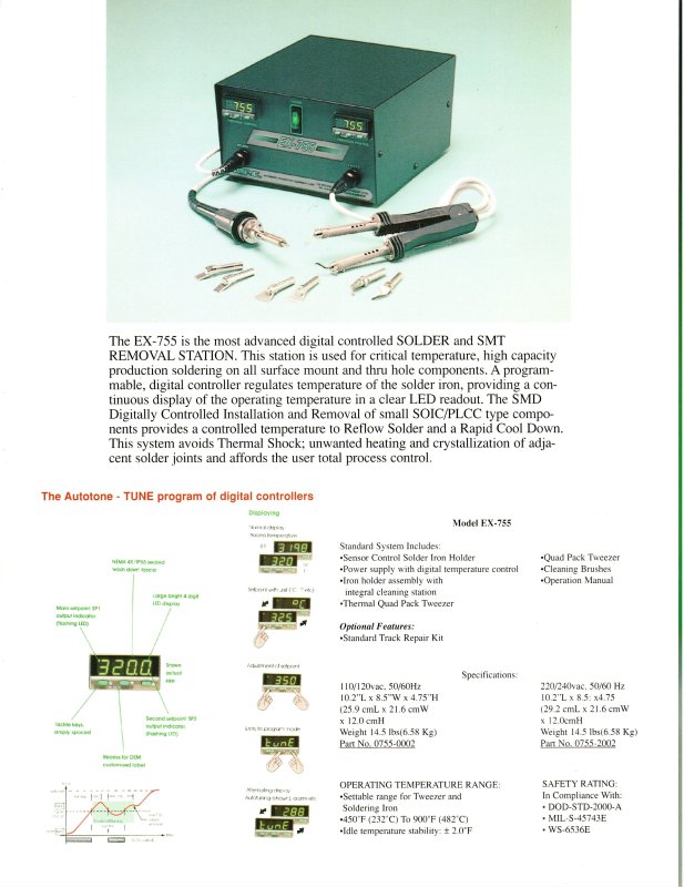 The EX-755 is the most advanced digital-controlled SOLDER and SMT REMOVAL STATION. This station is used for critical temperature, high capacity production soldering on all surface mount and thru hole components. A programmable, digital controller regulates temperature of the solder iron, providing a continuous display of the operating temperature clear LED readout. The SMD Digitally Controlled Installation and Removal of Small SOIC/PLCC type components provides a controlled temperature to Reflow Solder and a Rapid Cool Down. This system avoids Thermal Shock; unwanted heating and crystallization of adjacent solder joints and affords the user total process control.